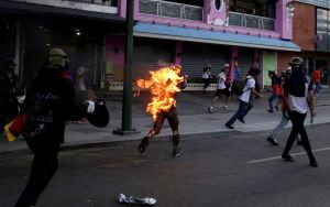 26-05-2017 – The images are as disturbing as they are frightening. Right-wing Venezuelans, knowing they have the direct and indirect backing of the US Empire, are literally burning down Venezuela. The most recent egregious example was the setting fire to a Venezuelan government supporter, on the grounds that he was a “Chavista”.[1] Right-wing opponents of the government led by President Nicolas Maduro also recently took a public bus driver hostage, and then set his bus on fire. Hispan TV reported the bus driver as saying “Honestly, if they had known that I support the Revolution….if I had said Homeland, Socialism or Death…. they would have killed me.”[2]